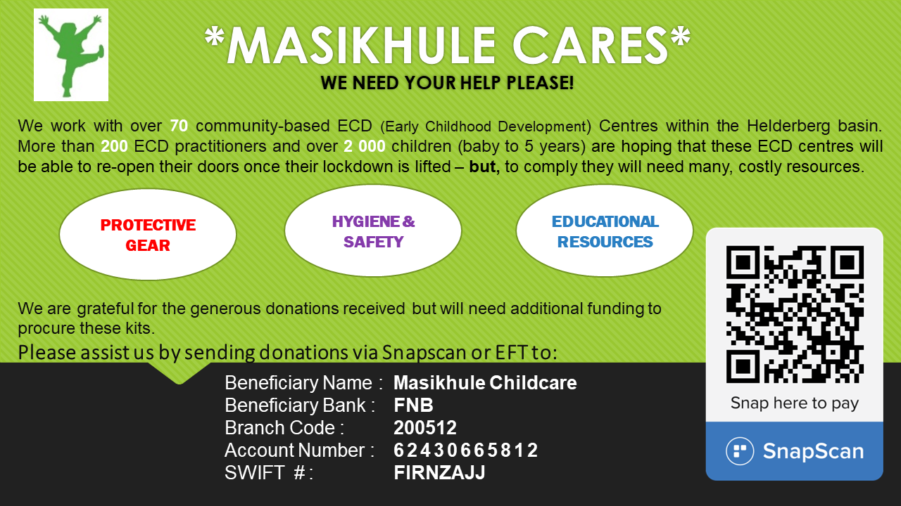 The Masikhule team will continue to assess and assist where we can – we are in contact with a large group of ECD principals and will keep trying to establish where the greatest needs are. Our future plans include ensuring that the 70+ community-based ECD centres we work with have the necessary training, equipment, resources and protocols in place for when ECDs re-open.